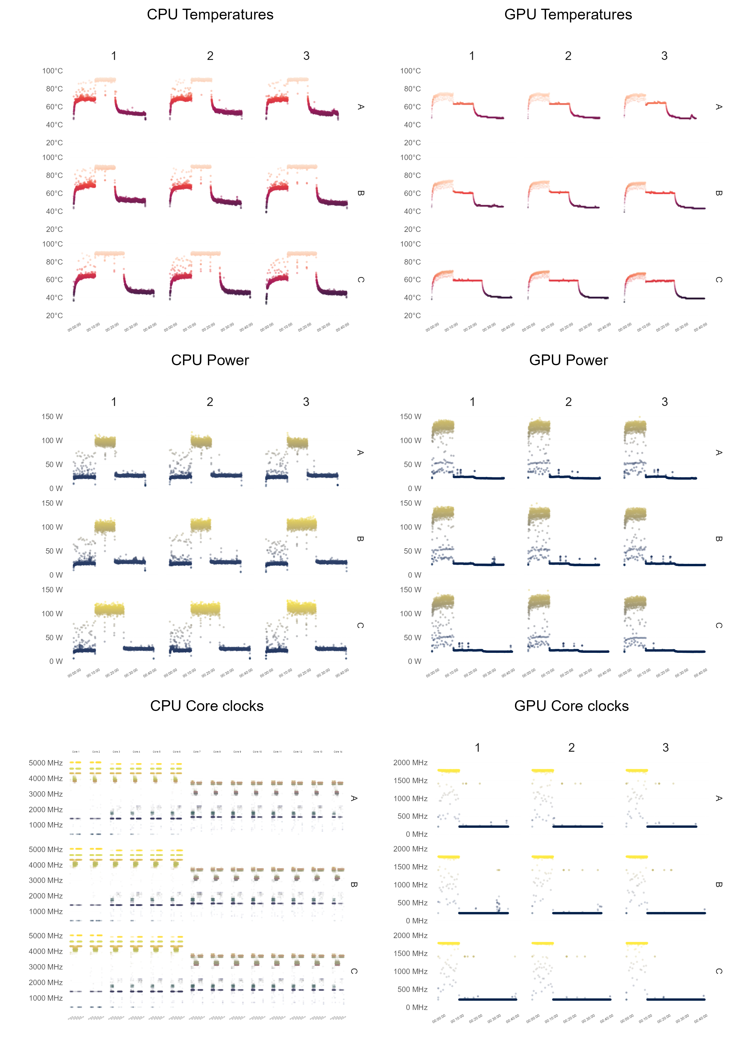 The time-series data above reveals three distinct phases corresponding to the different stress tests conducted in the Cinebench 2024 suite: GPU test, CPU Multi-Core test, and CPU Single-Core test. To enable a more detailed analysis of the data for each stress test, it will be essential to label the data according to these phases. As an exploratory step, we can apply an unsupervised classification algorithm, specifically K-Means clustering, to automatically identify these phases. While K-Means performed reasonably well in distinguishing the different phases, it was not perfect. Ultimately we decided to manually label the data based on the known timing of each test and the expected system performance metrics for each phase.